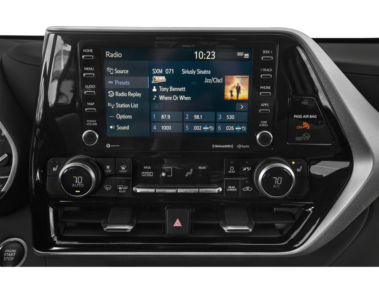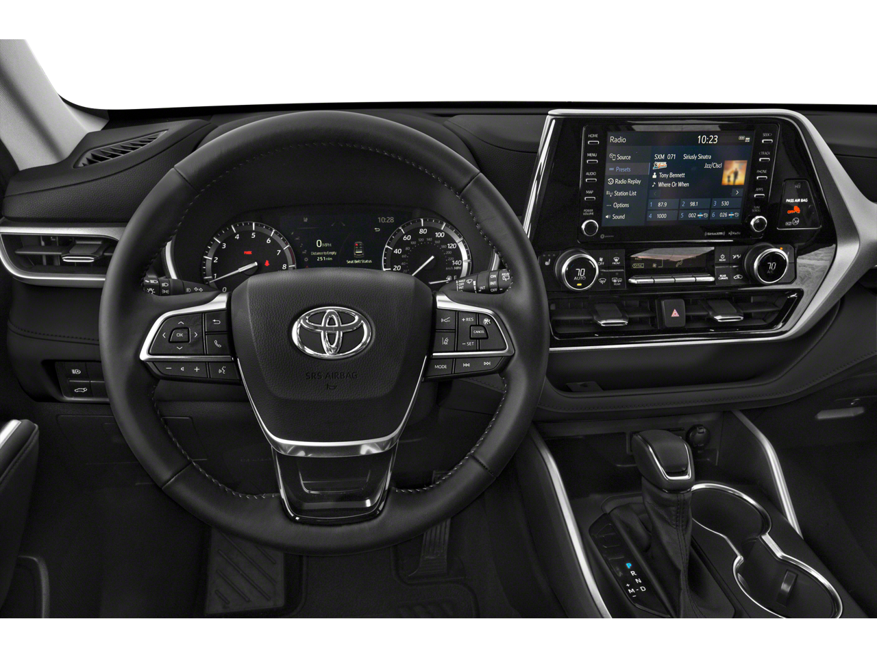 This Highlander XLE is nicely equipped with 18 Machined Alloy Wheels, 3.003 Axle Ratio, 3rd row seats: split-bench, 4-Wheel Disc Brakes, 6 Speakers, ABS brakes, Air Conditioning, Alloy wheels, AM/FM radio: SiriusXM, Apple CarPlay/Android Auto, Auto High-beam Headlights, Auto-dimming Rear-View mirror, Automatic temperature control, Brake assist, Bumpers: body-color, Delay-off headlights, Driver door bin, Driver vanity mirror, Dual front impact airbags, Dual front side impact airbags, Electronic Stability Control, Emergency communication system: Safety Connect with 1-year trial, Exterior Parking Camera Rear, Four wheel independent suspension, Front anti-roll bar, Front Bucket Seats, Front Center Armrest, Front dual zone A/C, Front fog lights, Front reading lights, Fully automatic headlights, Garage door transmitter: HomeLink, Heated door mirrors, Heated Front Bucket Seats, Heated front seats, Illuminated entry, Knee airbag, Leather Shift Knob, Low tire pressure warning, Occupant sensing airbag, Outside temperature display, Overhead airbag, Overhead console, Panic alarm, Passenger door bin, Passenger vanity mirror, Power door mirrors, Power driver seat, Power Liftgate, Power moonroof, Power passenger seat, Power steering, Power windows, Radio: Audio Plus, Rear air conditioning, Rear anti-roll bar, Rear reading lights, Rear window defroster, Rear window wiper, Reclining 3rd row seat, Remote keyless entry, Roof rack: rails only, Security system, SofTex Seat Trim, Speed control, Speed-sensing steering, Split folding rear seat, Spoiler, Steering wheel mounted audio controls, Tachometer, Telescoping steering wheel, Tilt steering wheel, Traction control, Trip computer, Turn signal indicator mirrors, and Variably intermittent wipers.