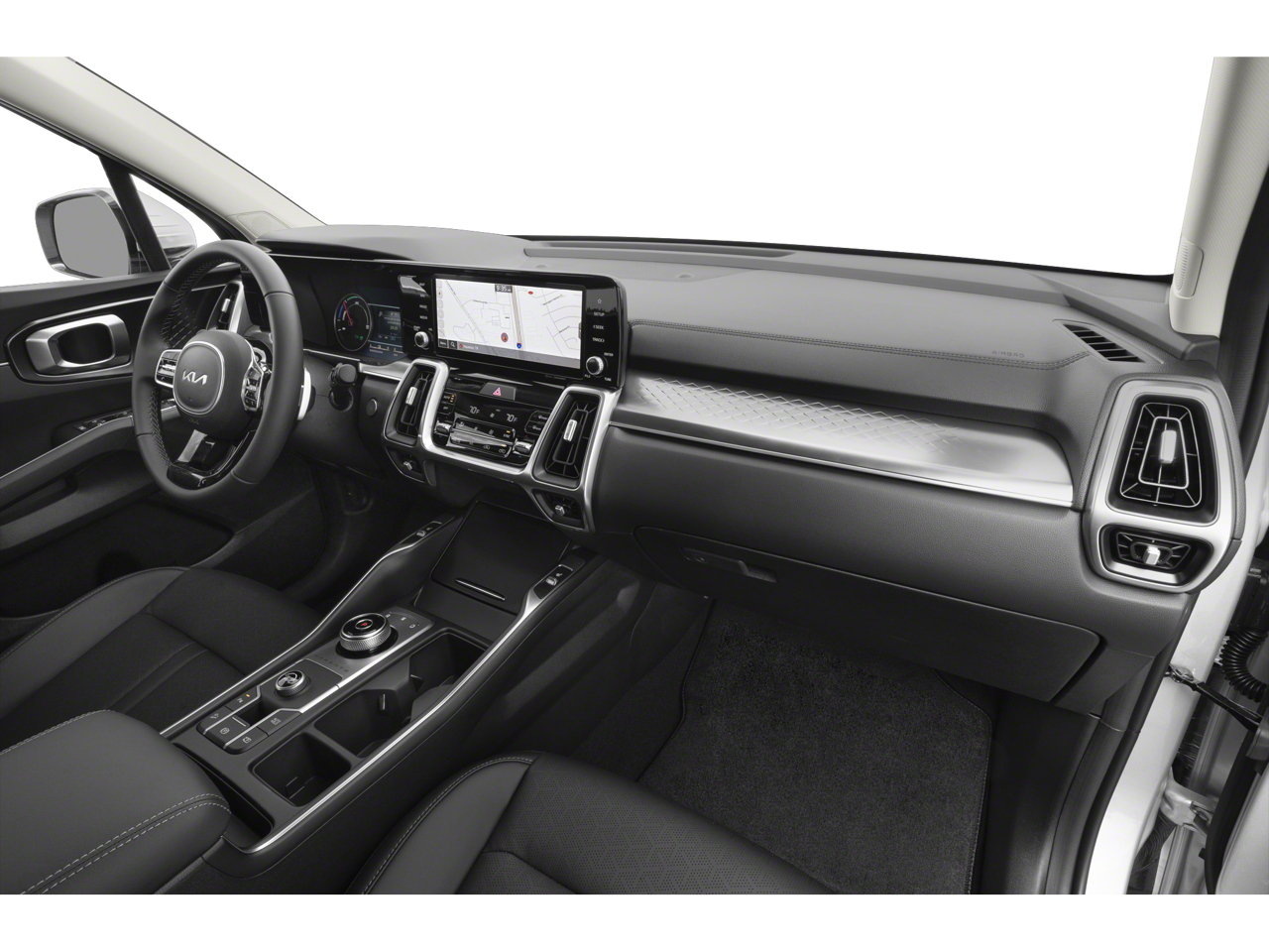 This Sorento Hybrid EX is nicely equipped with 3rd row seats: split-bench, 4-Wheel Disc Brakes, 6 Speakers, ABS brakes, Air Conditioning, Alloy wheels, AM/FM radio: SiriusXM, Apple CarPlay & Android Auto, Auto High-beam Headlights, Automatic temperature control, Axle Ratio: 3.510, Brake assist, Bumpers: body-color, Carpet Floor Mats, Delay-off headlights, Driver door bin, Driver vanity mirror, Dual front impact airbags, Dual front side impact airbags, Electronic Stability Control, Emergency communication system: 911 Connect, Exterior Parking Camera Rear, Four wheel independent suspension, Front anti-roll bar, Front Bucket Seats, Front Center Armrest, Front dual zone A/C, Front fog lights, Front reading lights, Fully automatic headlights, Heated door mirrors, Heated Front Bucket Seats, Heated front seats, Illuminated entry, Knee airbag, Leather steering wheel, Low tire pressure warning, Navigation System, Occupant sensing airbag, Outside temperature display, Overhead airbag, Overhead console, Panic alarm, Passenger door bin, Passenger vanity mirror, Power door mirrors, Power driver seat, Power Liftgate, Power passenger seat, Power steering, Power windows, Radio data system, Radio: AM/FM/SiriusXM Audio System, Rear air conditioning, Rear anti-roll bar, Rear reading lights, Rear window defroster, Rear window wiper, Remote keyless entry, Security system, Smart Key w/ Push Button and Remote Start, Speed control, Speed-sensing steering, Split folding rear seat, Spoiler, Steering wheel mounted audio controls, SynTex Artificial Leather Seat Trim, Tachometer, Telescoping steering wheel, Tilt steering wheel, Traction control, Trip computer, Turn signal indicator mirrors, Variably intermittent wipers, and Wheels: 19 Machine-Finished Aero Alloy.