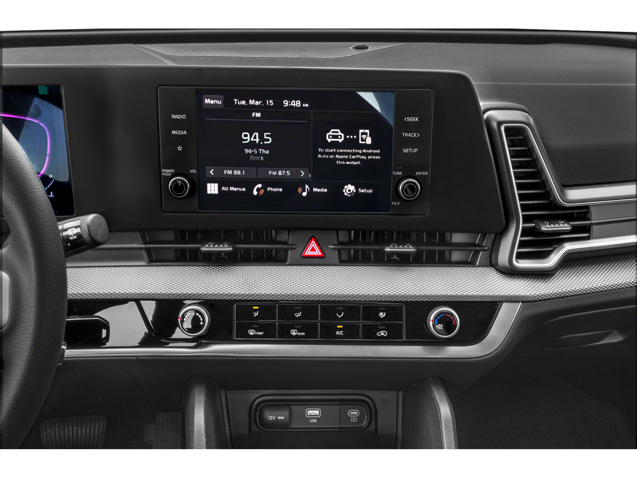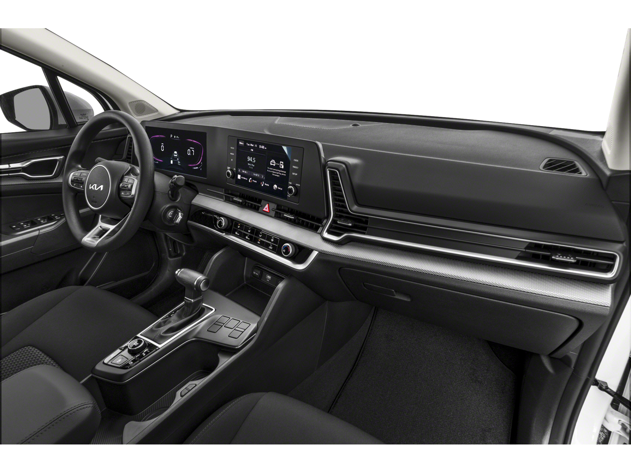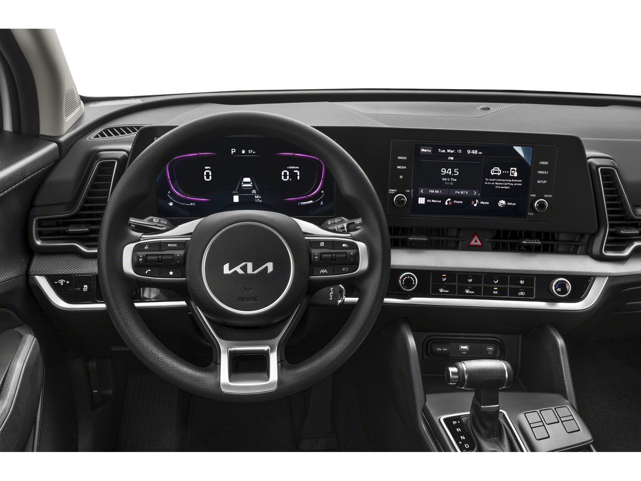 This Sportage LX is nicely equipped with 17 Alloy Wheels, 4-Wheel Disc Brakes, 6 Speakers, ABS brakes, Air Conditioning, Alloy wheels, AM/FM radio, Auto High-beam Headlights, Axle Ratio: 3.648, Brake assist, Bumpers: body-color, Carpeted Floor Mats, Cloth Seat Trim, Delay-off headlights, Driver door bin, Driver vanity mirror, Dual front impact airbags, Dual front side impact airbags, Electronic Stability Control, Four wheel independent suspension, Front anti-roll bar, Front Bucket Seats, Front Center Armrest, Fully automatic headlights, Illuminated entry, Low tire pressure warning, Occupant sensing airbag, Outside temperature display, Overhead airbag, Overhead console, Panic alarm, Passenger door bin, Passenger vanity mirror, Power door mirrors, Power steering, Power windows, Radio: AM/FM/HD Audio System, Rear anti-roll bar, Rear seat center armrest, Rear side impact airbag, Rear window defroster, Rear window wiper, Remote keyless entry, Security system, Speed control, Speed-sensing steering, Split folding rear seat, Spoiler, Steering wheel mounted audio controls, Tachometer, Telescoping steering wheel, Tilt steering wheel, Traction control, Trip computer, and Variably intermittent wipers.